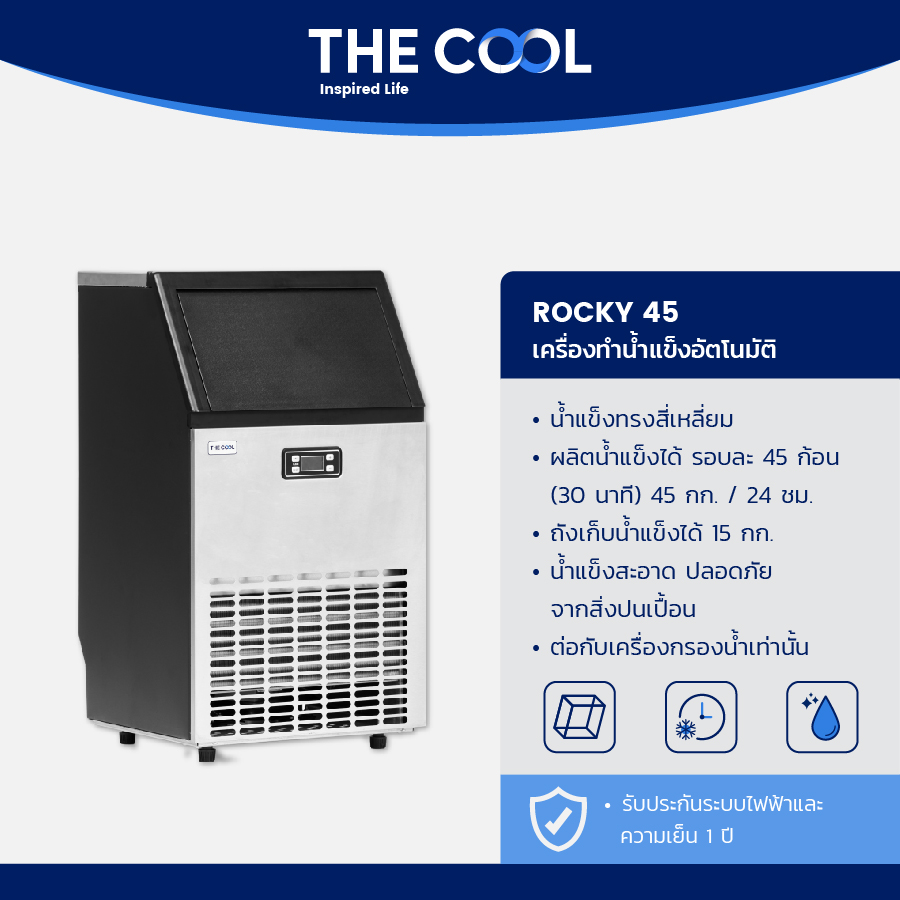 - เครื่องผลิตน้ำแข็ง Rocky 45 เป็นเครื่องผลิตน้ำแข็งเท่านั้น ไม่ได้ ทำความเย็น สำหรับแช่น้ำแข็ง ตลอดเวลา